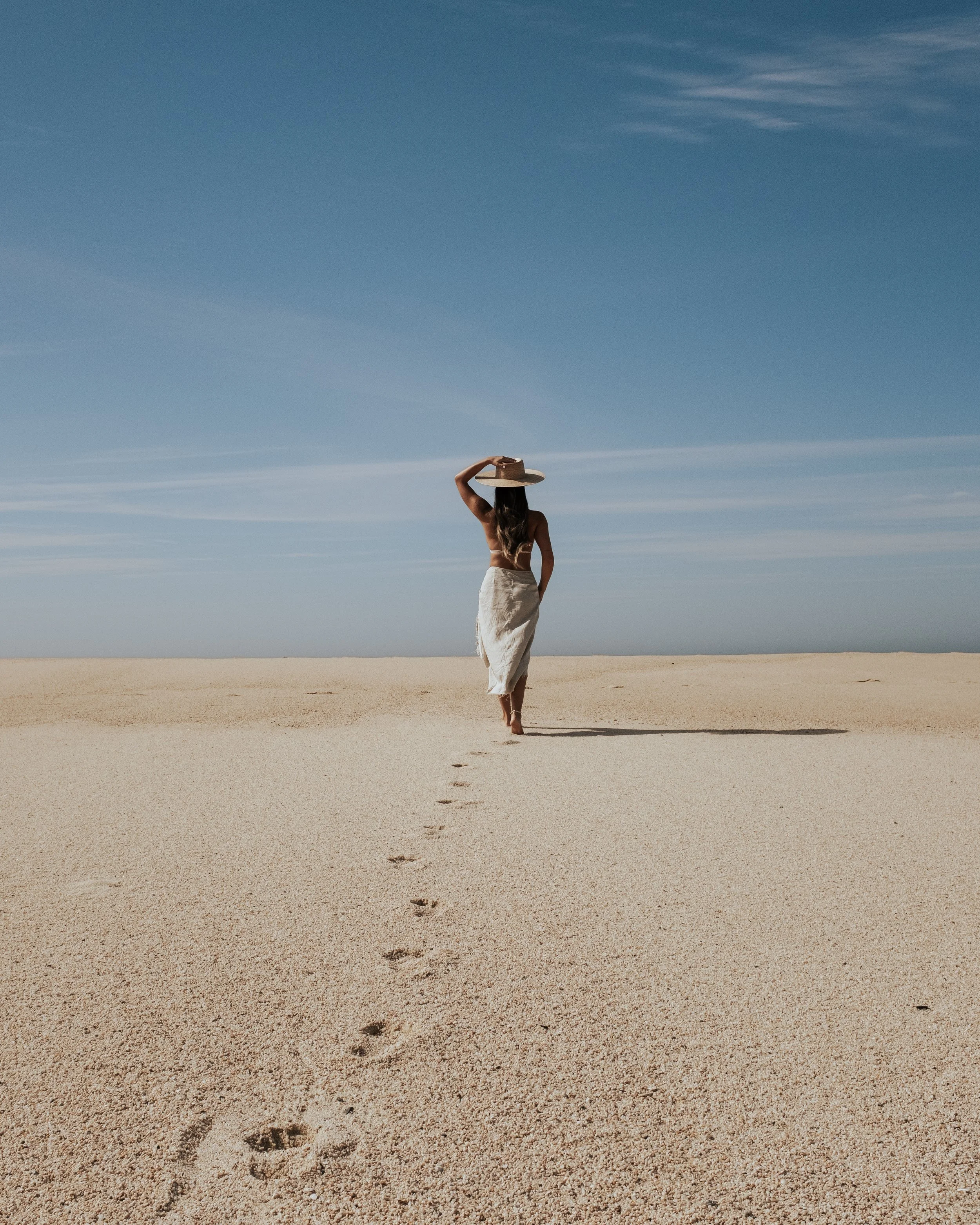 Woman standing on a beach at sunset with waves in the background, wearing a white top and patterned skirt, hair blowing in the wind.