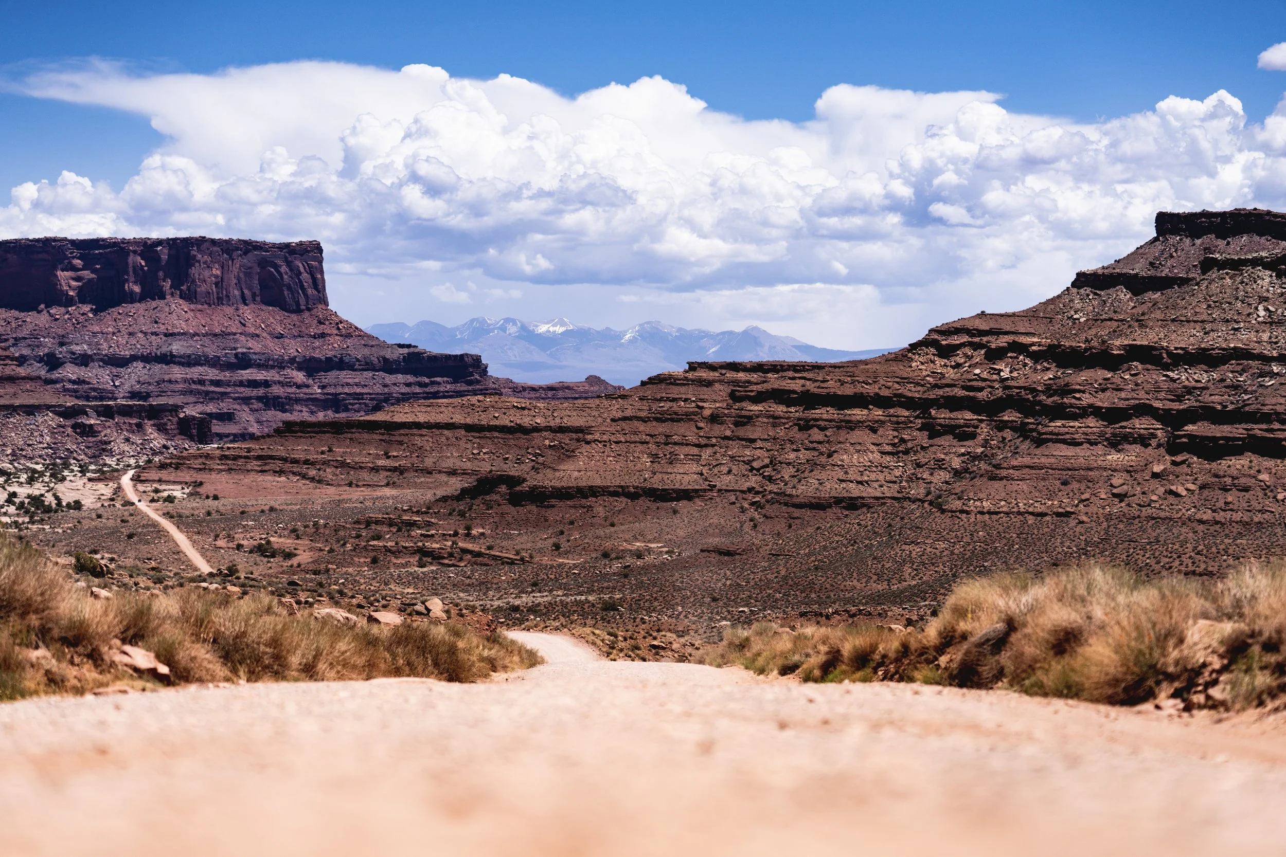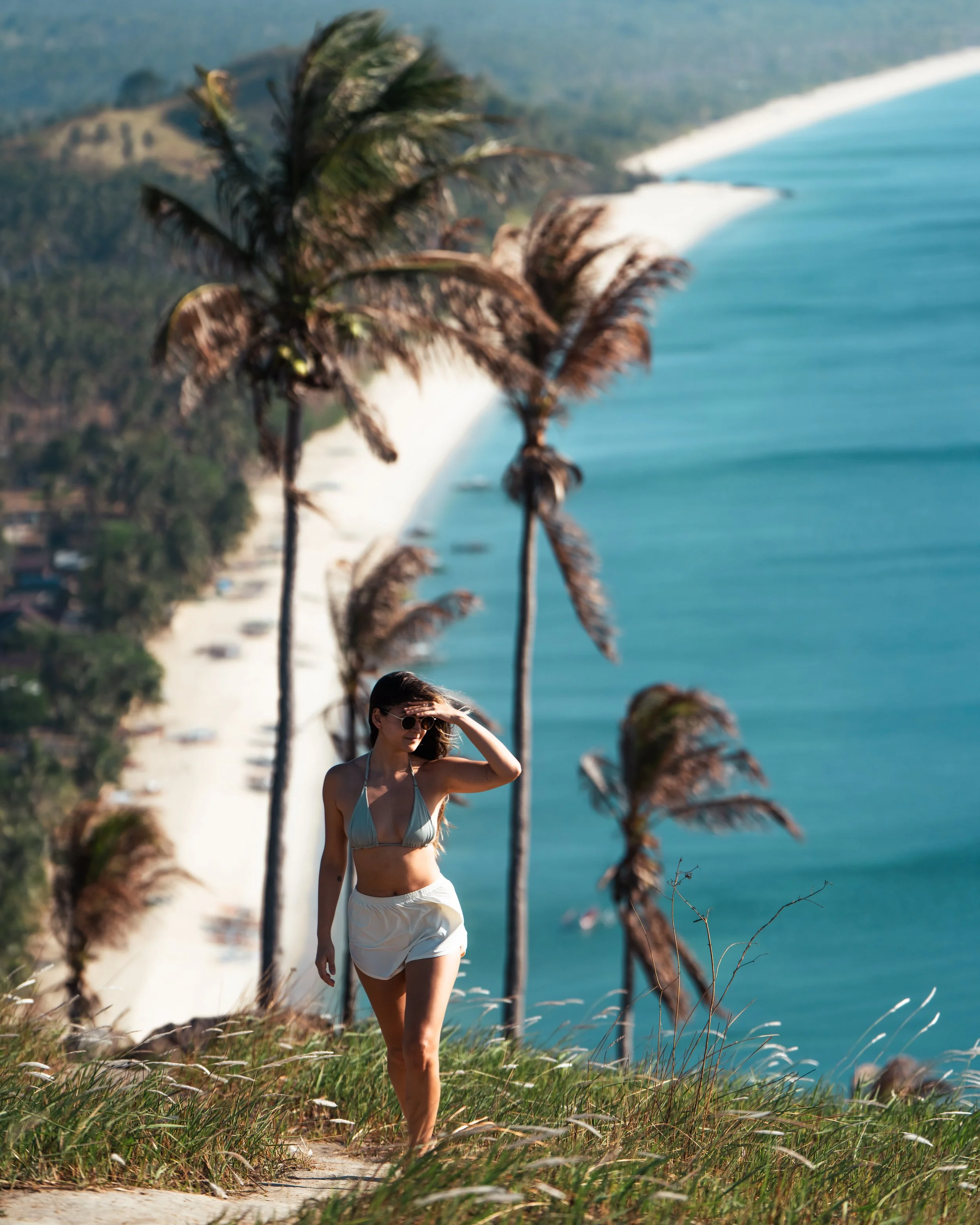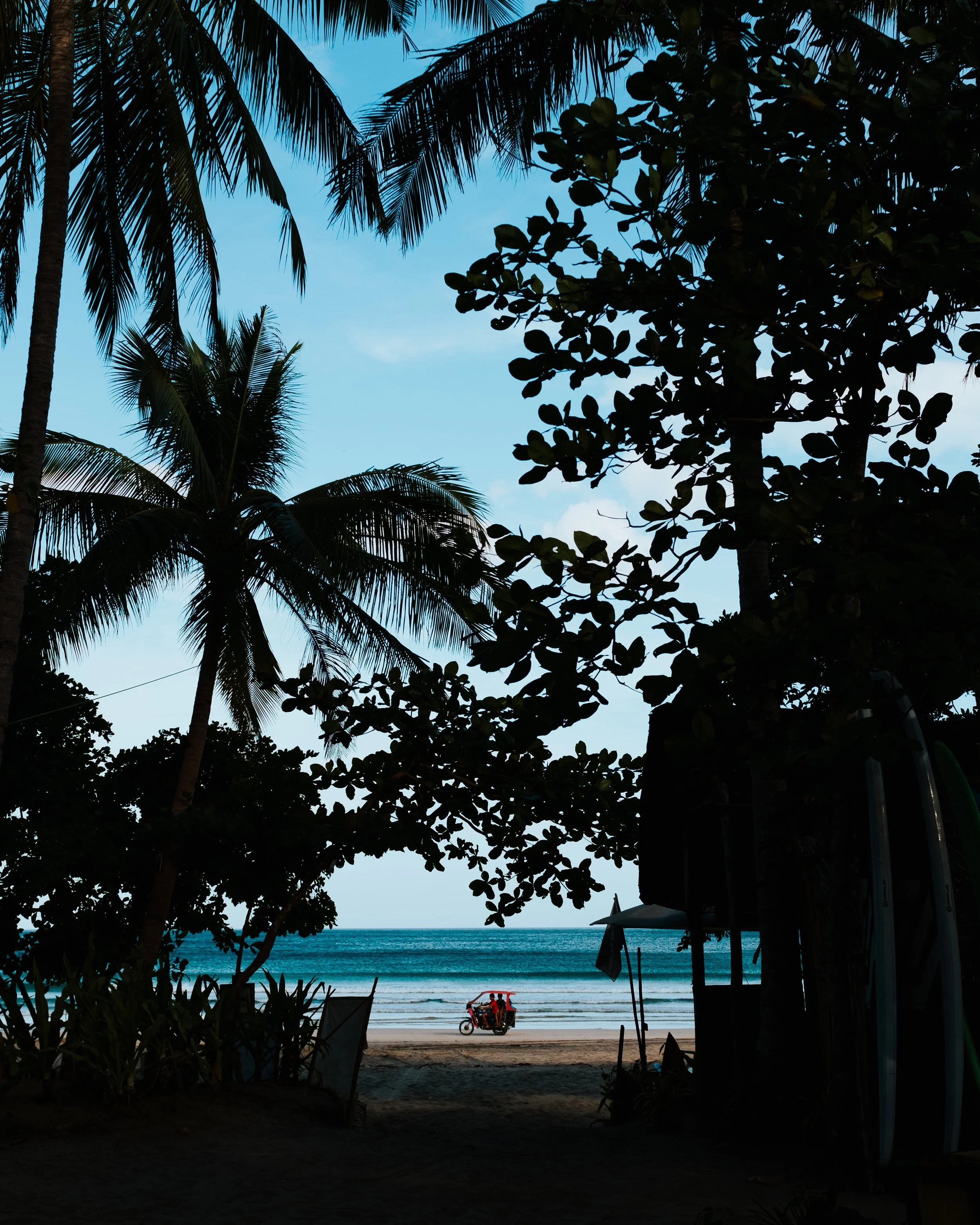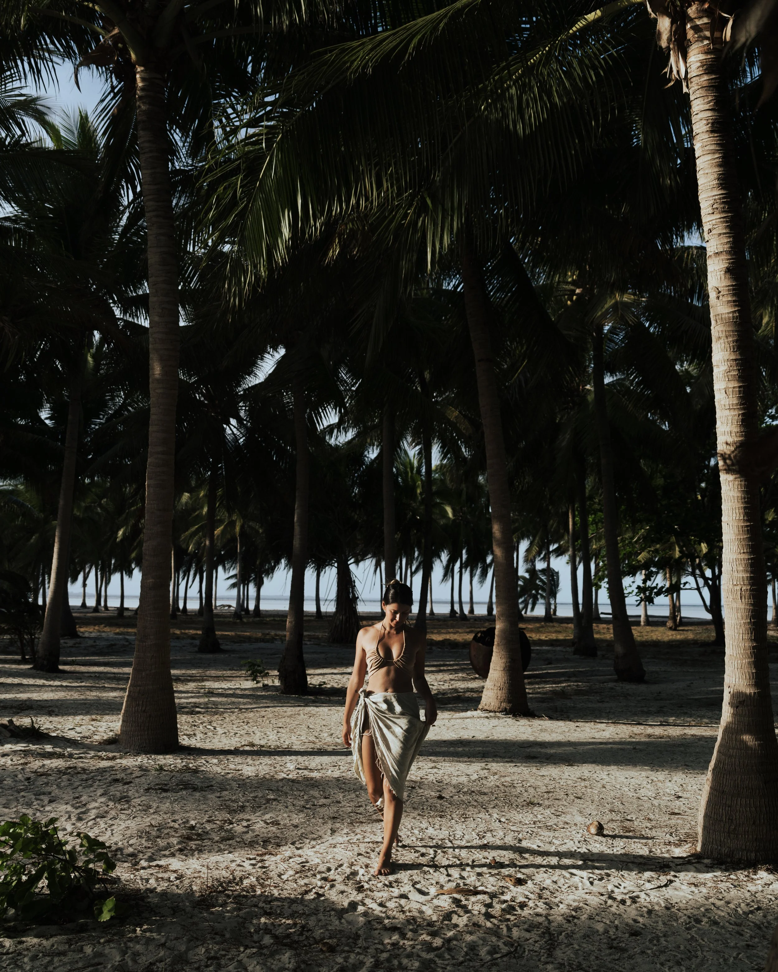 A person walking on a sandy path surrounded by tall palm trees in tropical sunlight.