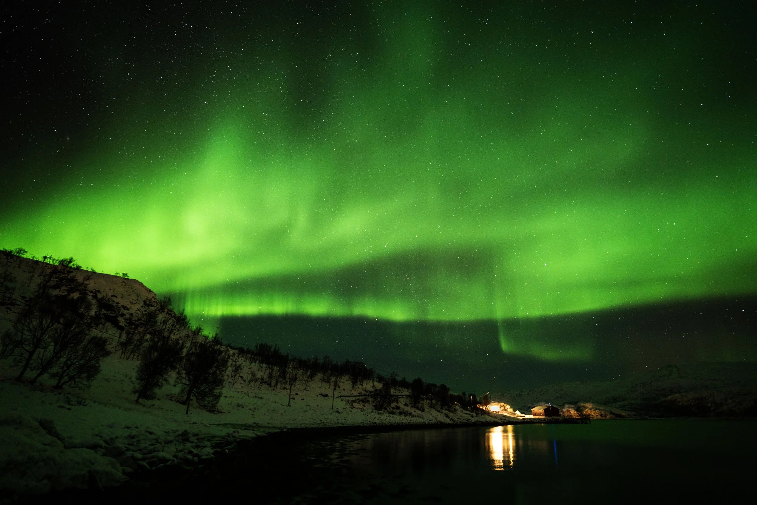 Person in a brown coat and pink scarf standing on a snowy dock by a snowy mountain landscape with boats in the water.