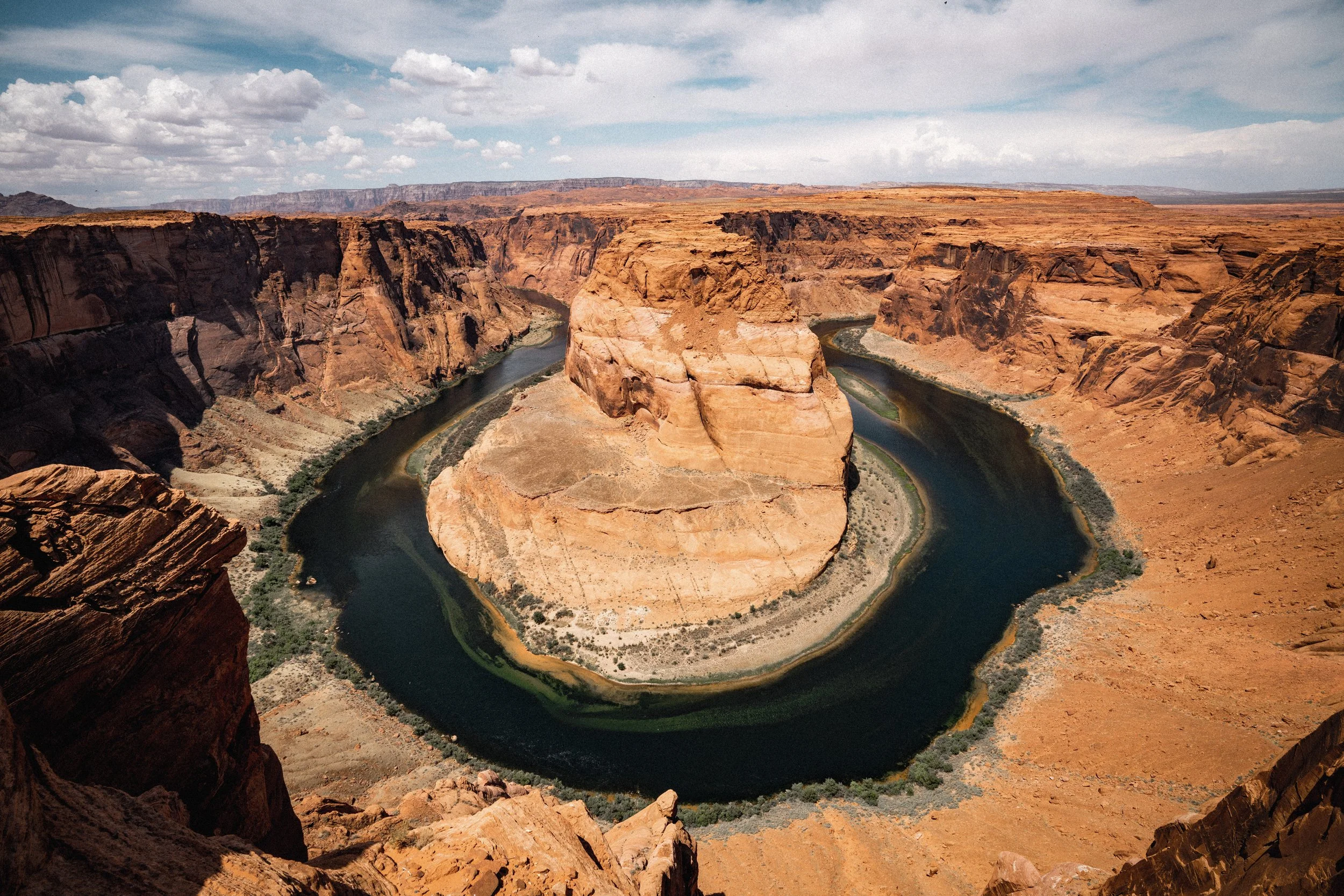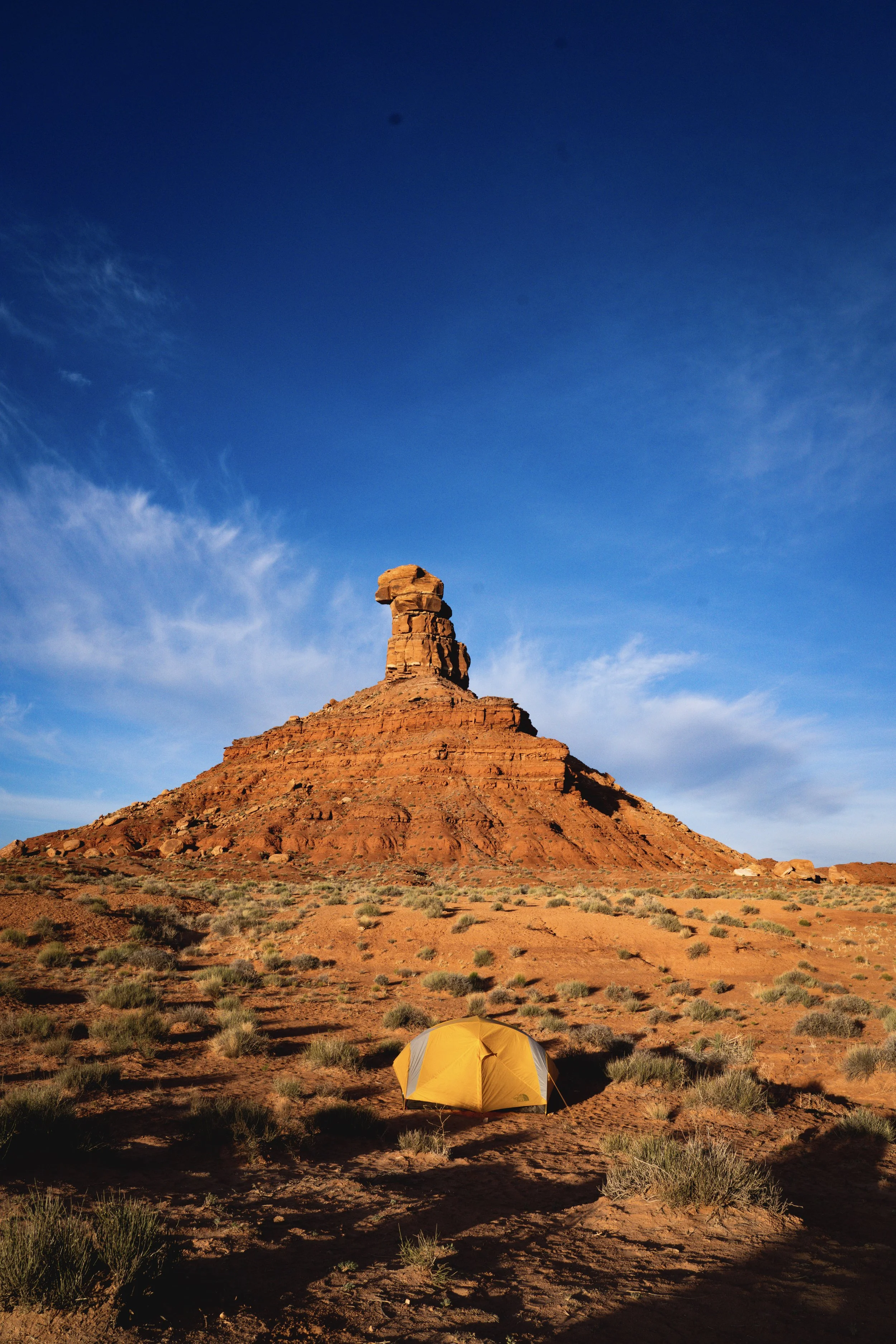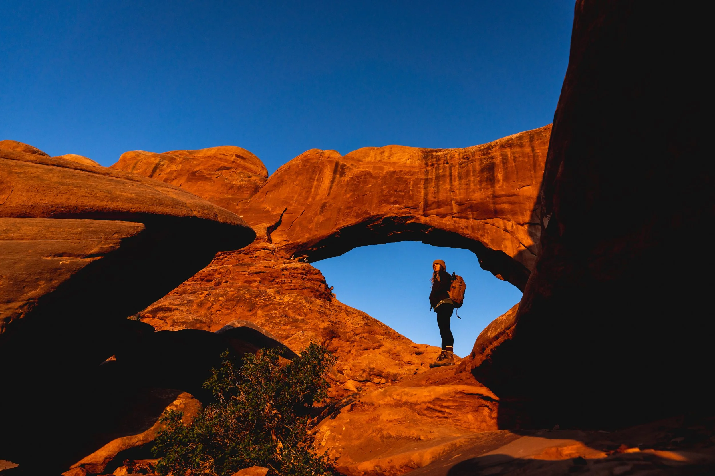 Person standing near large sandstone arch formation at sunrise in desert landscape