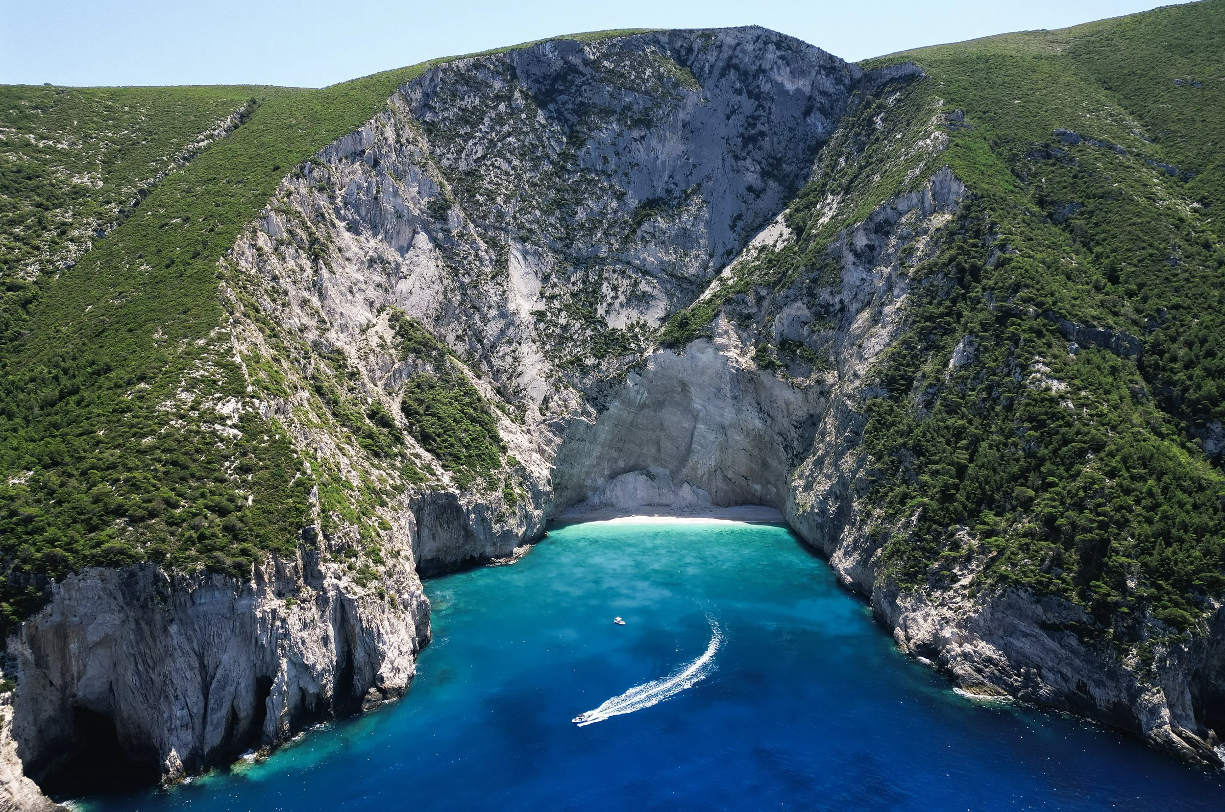 Aerial view of a catamaran and a small boat on clear turquoise water.