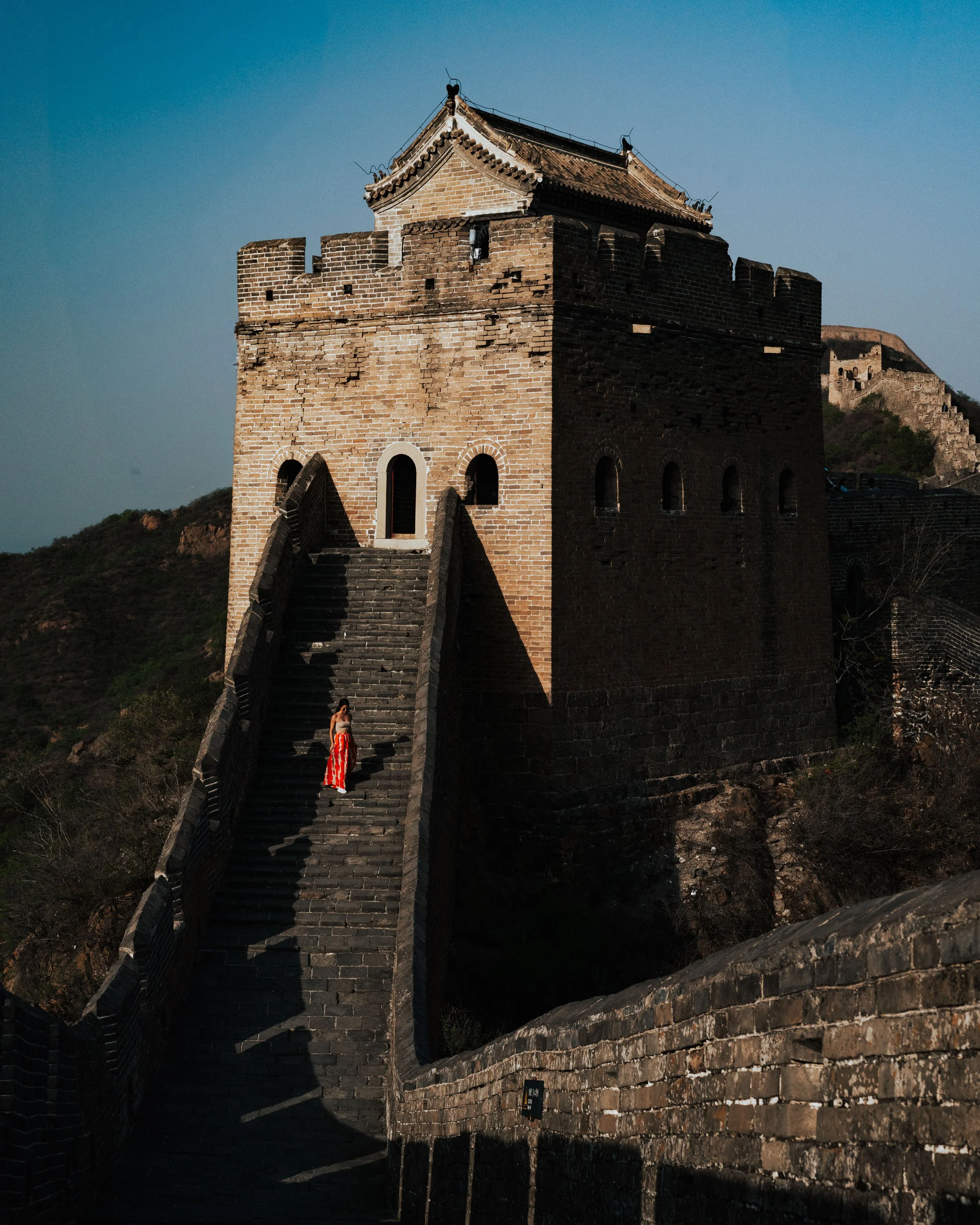 Black and white photo of a person with flowing hair standing on the Great Wall of China