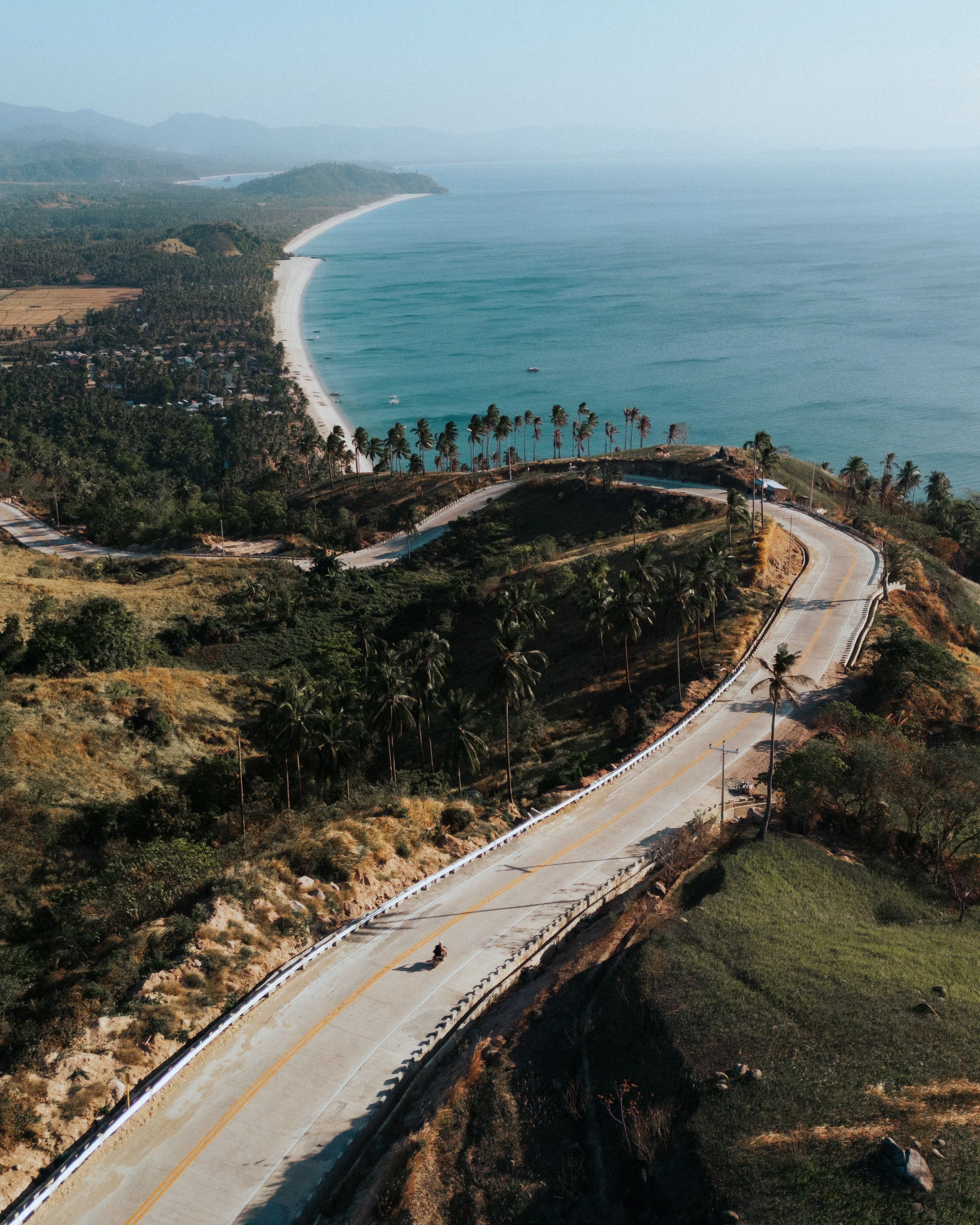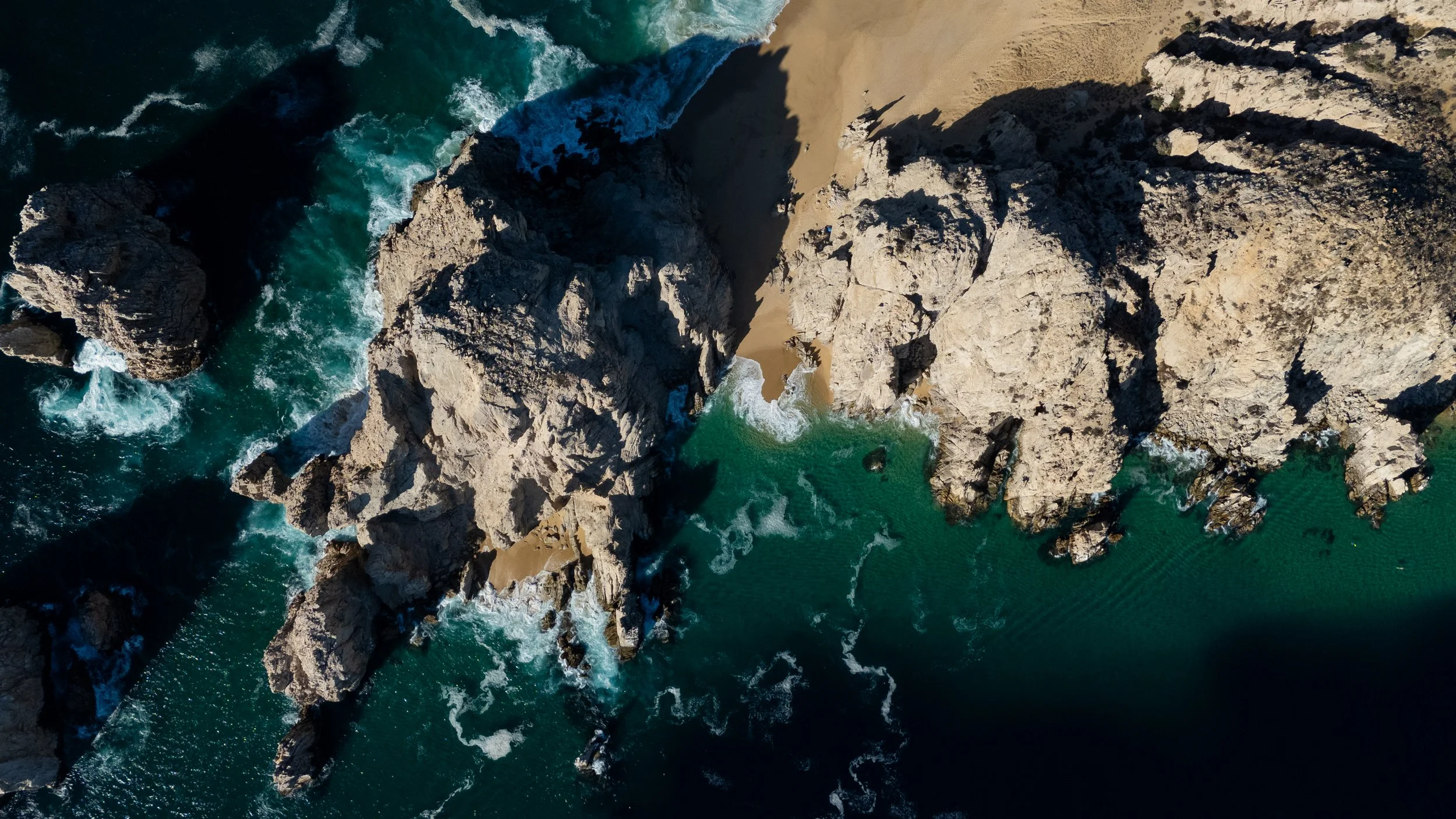 Aerial view of a tropical coastline with lush green forest on the left and turquoise ocean waves on the right.