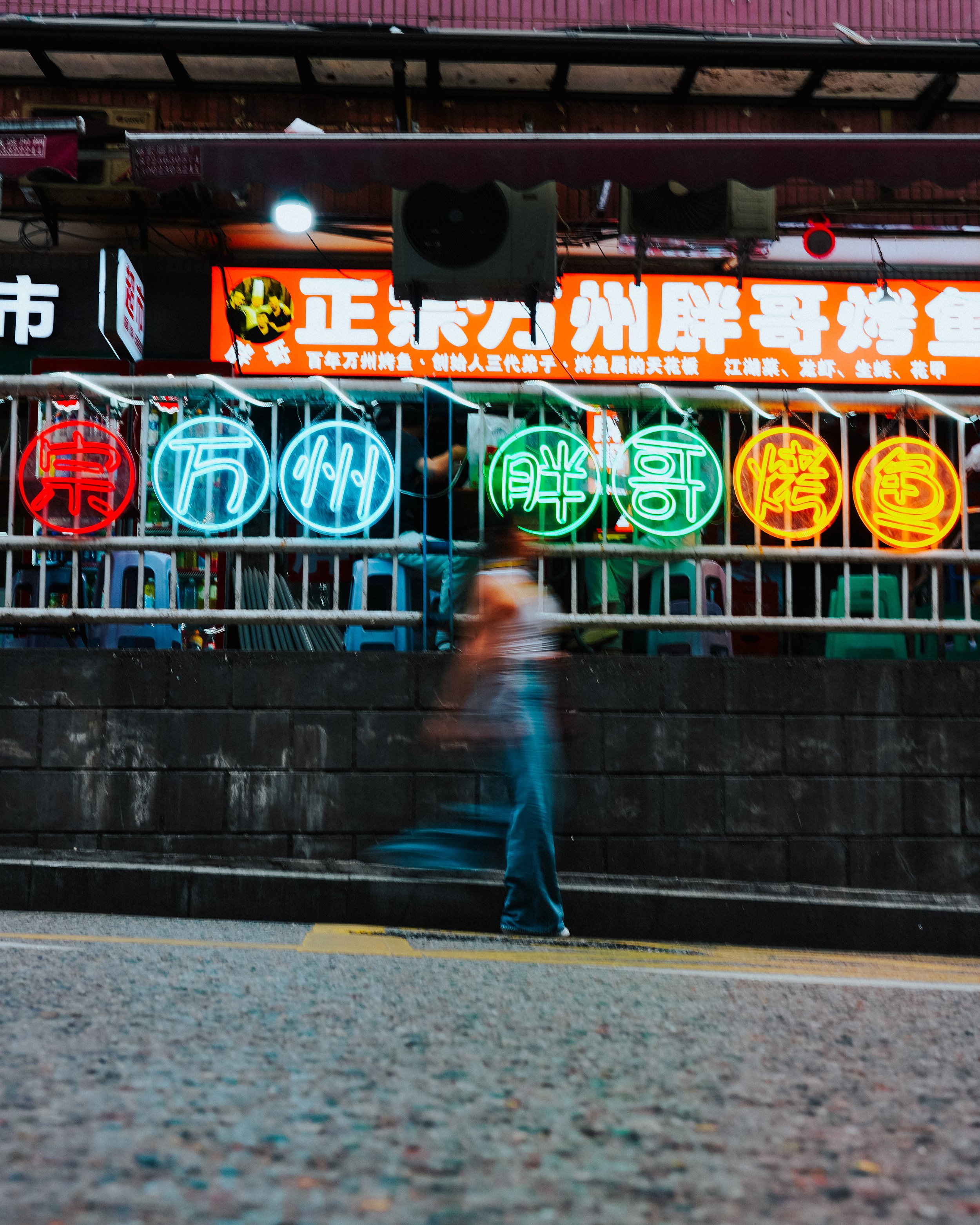 Person in traditional Chinese attire standing on a stone bridge with ornate carvings, viewed from behind, in a black and white photo.