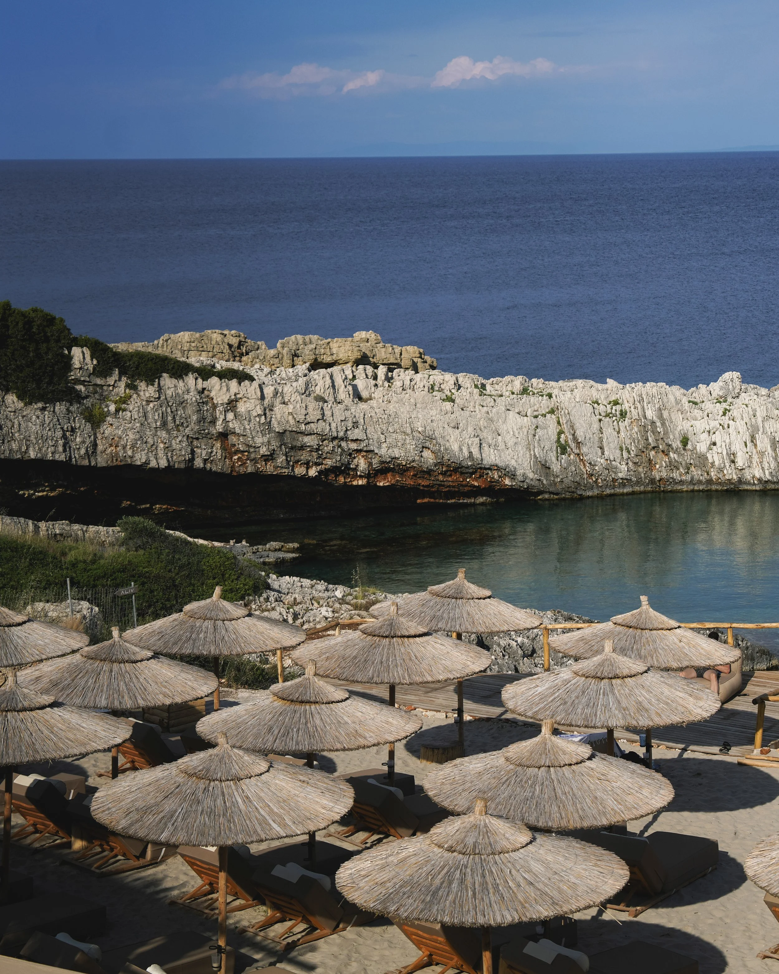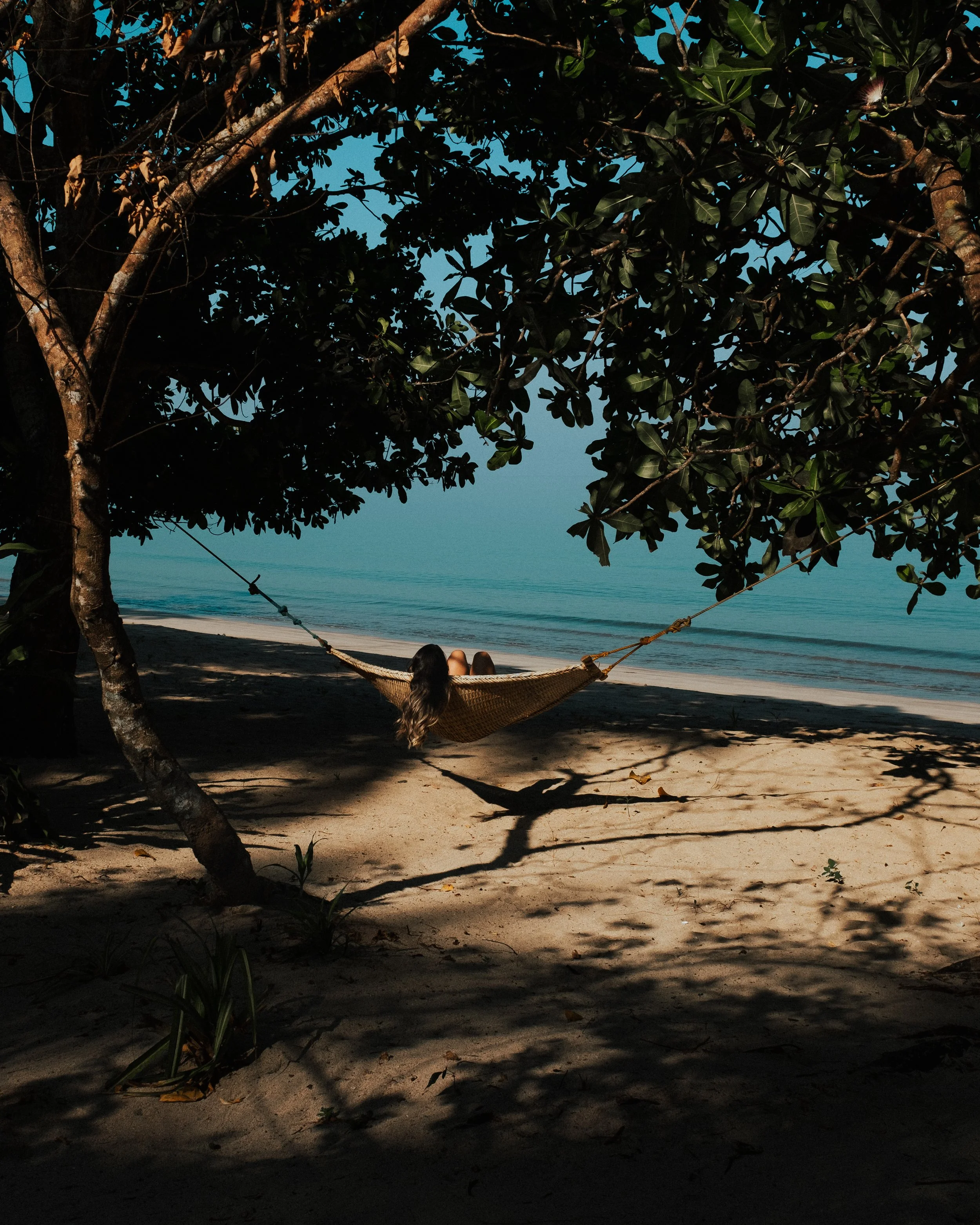 Person relaxing in a hammock on a sandy beach surrounded by trees, with the ocean in the background.