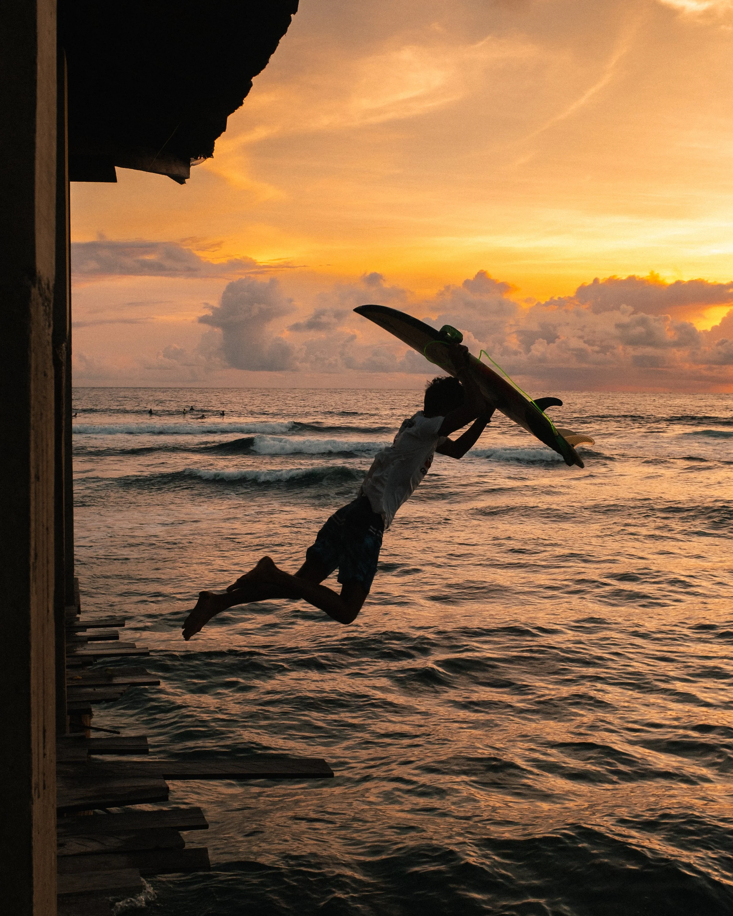 Black and white image of a surfer jumping off a wooden platform towards the ocean with a surfboard, under a cloudy sky.