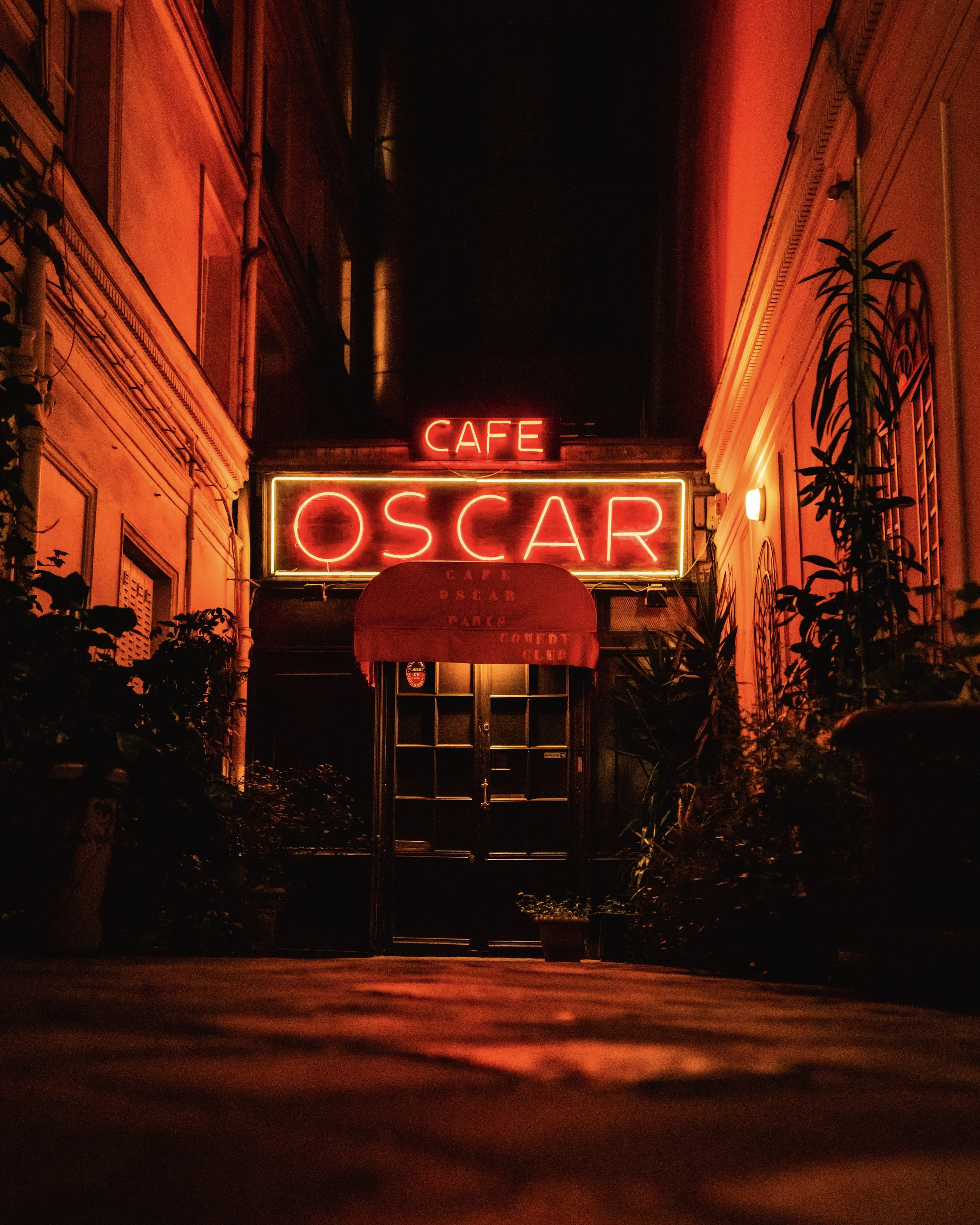 Black and white alleyway with overhead utility wires, various signs, and air conditioning units, suggesting an urban setting.